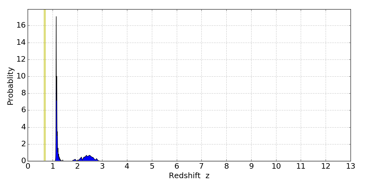 In P(z) plots: Yellow lines mark the cluster redshift z = 0.677,