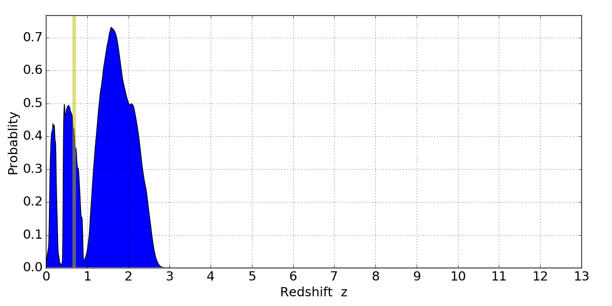 In P(z) plots: Yellow lines mark the cluster redshift z = 0.677,