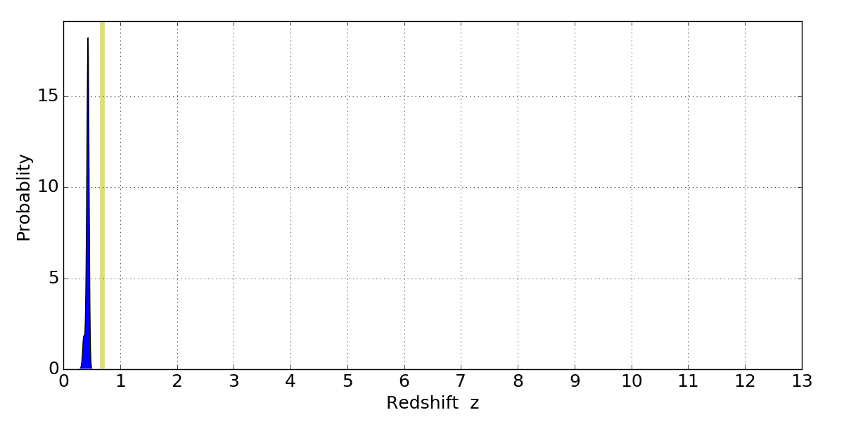 In P(z) plots: Yellow lines mark the cluster redshift z = 0.677,