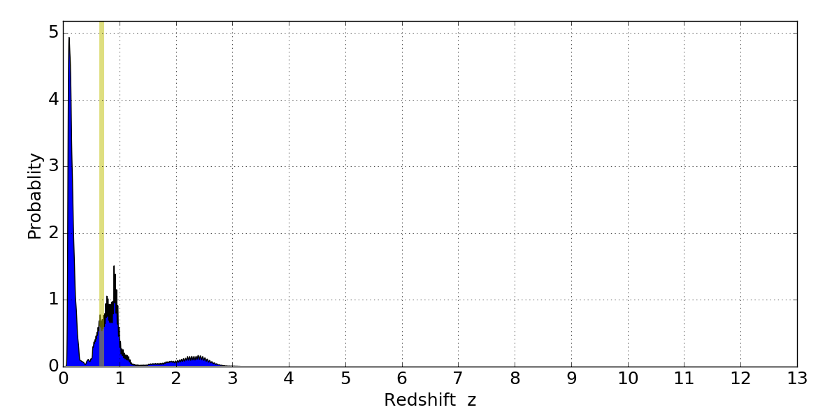 In P(z) plots: Yellow lines mark the cluster redshift z = 0.677,