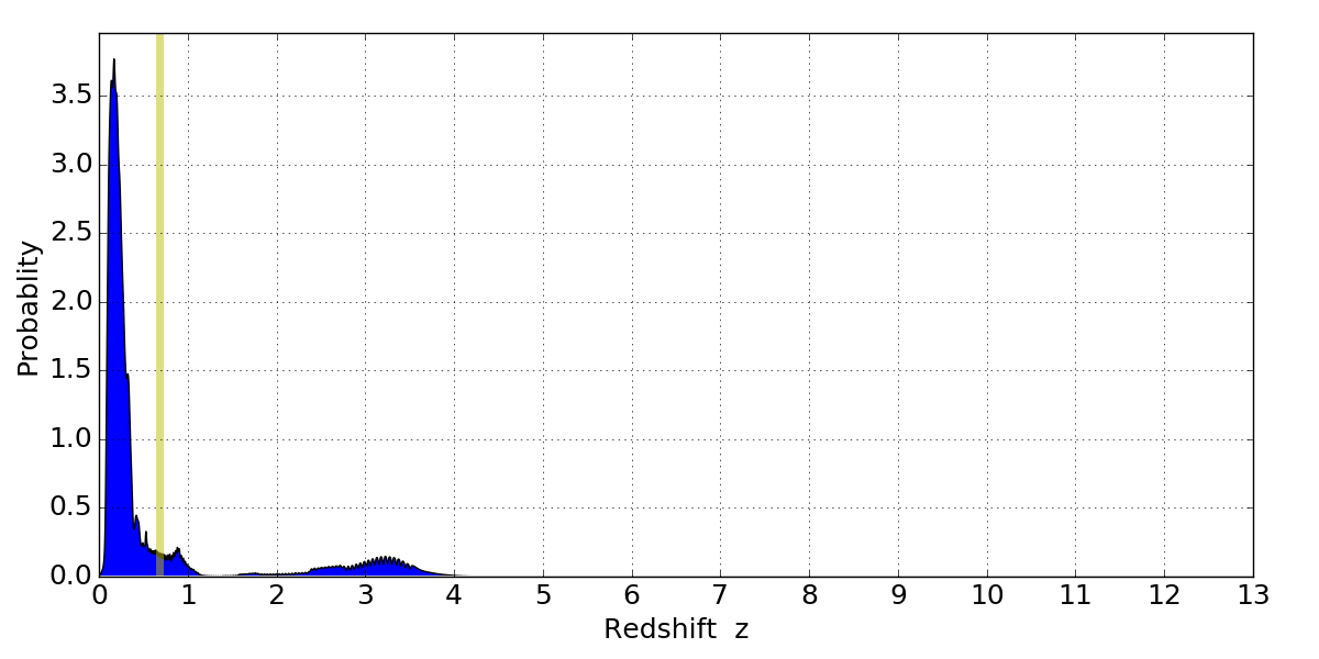 In P(z) plots: Yellow lines mark the cluster redshift z = 0.677,