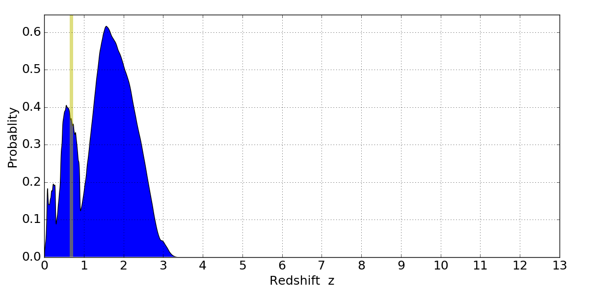 In P(z) plots: Yellow lines mark the cluster redshift z = 0.677,