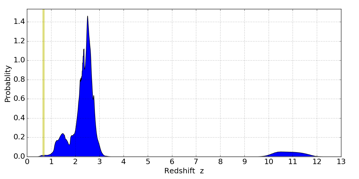 In P(z) plots: Yellow lines mark the cluster redshift z = 0.677,