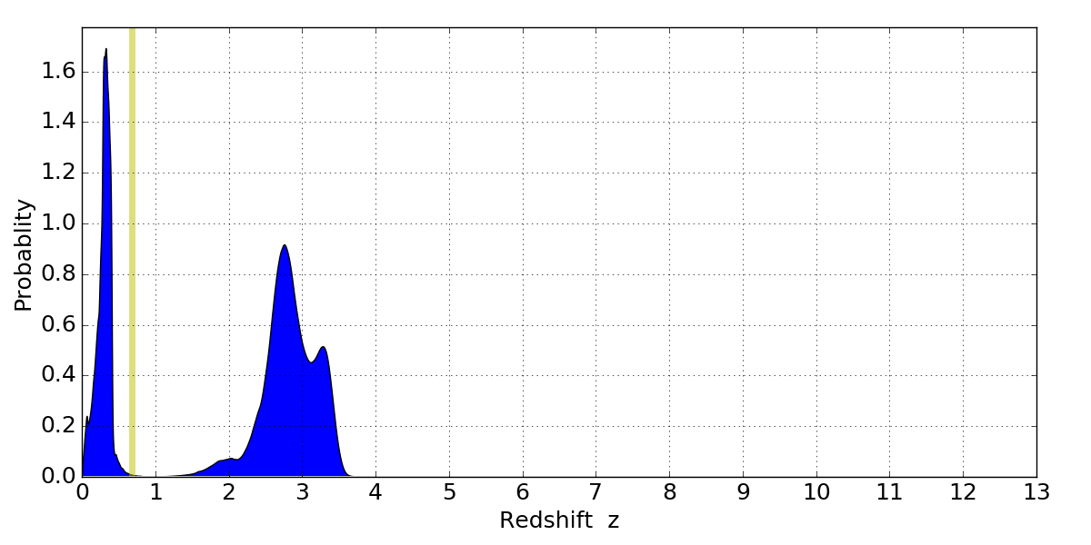 In P(z) plots: Yellow lines mark the cluster redshift z = 0.677,