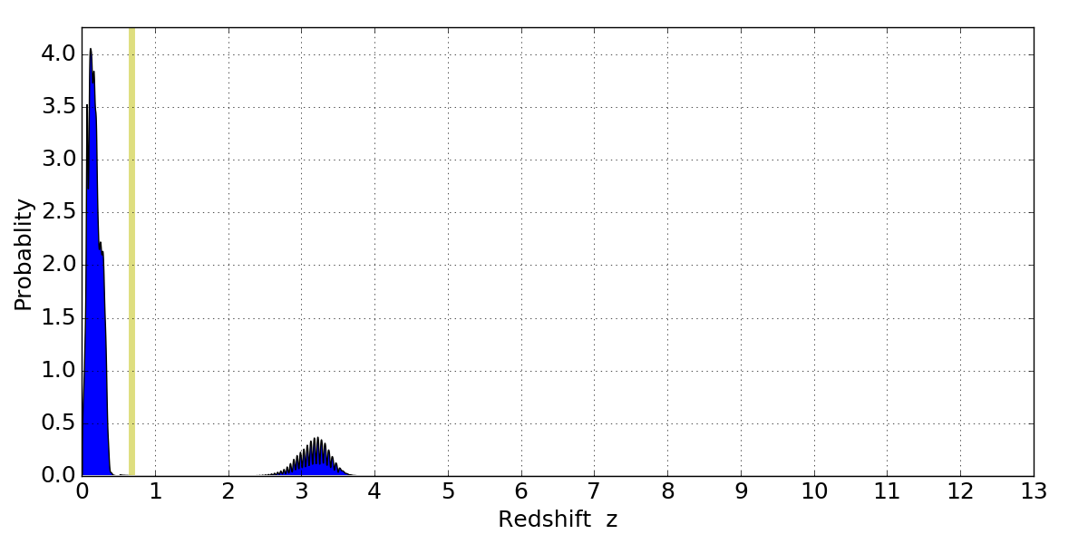 In P(z) plots: Yellow lines mark the cluster redshift z = 0.677,