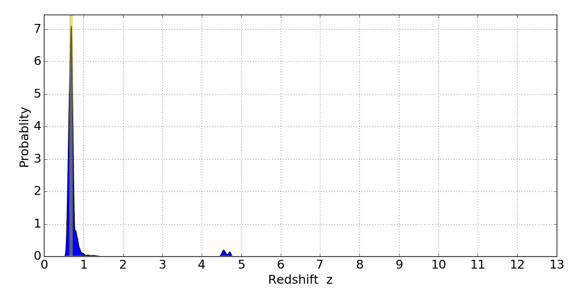 In P(z) plots: Yellow lines mark the cluster redshift z = 0.677,
