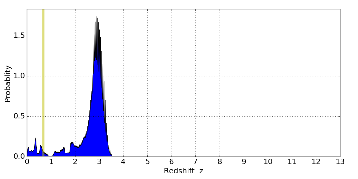 In P(z) plots: Yellow lines mark the cluster redshift z = 0.677,