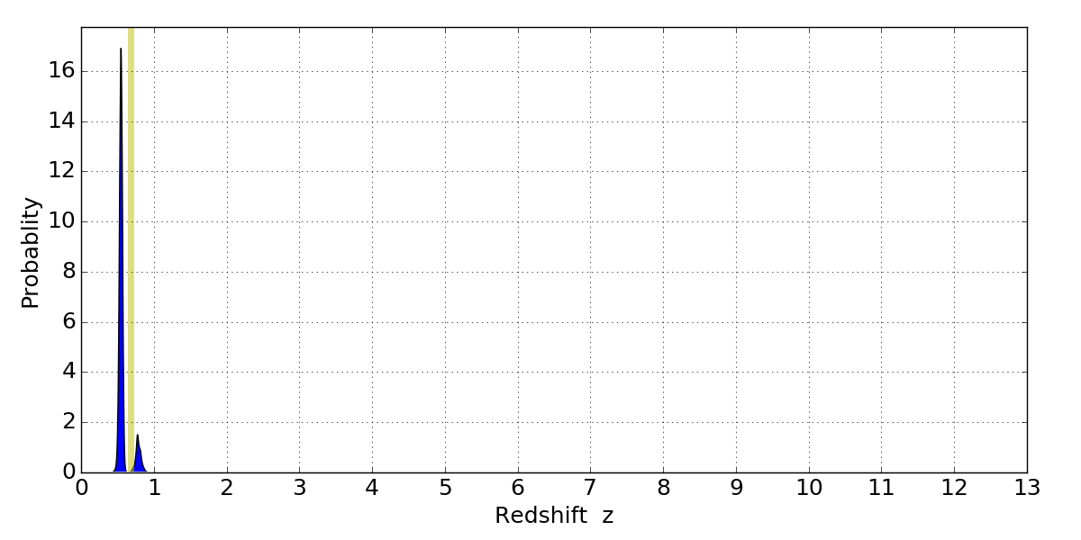 In P(z) plots: Yellow lines mark the cluster redshift z = 0.677,
