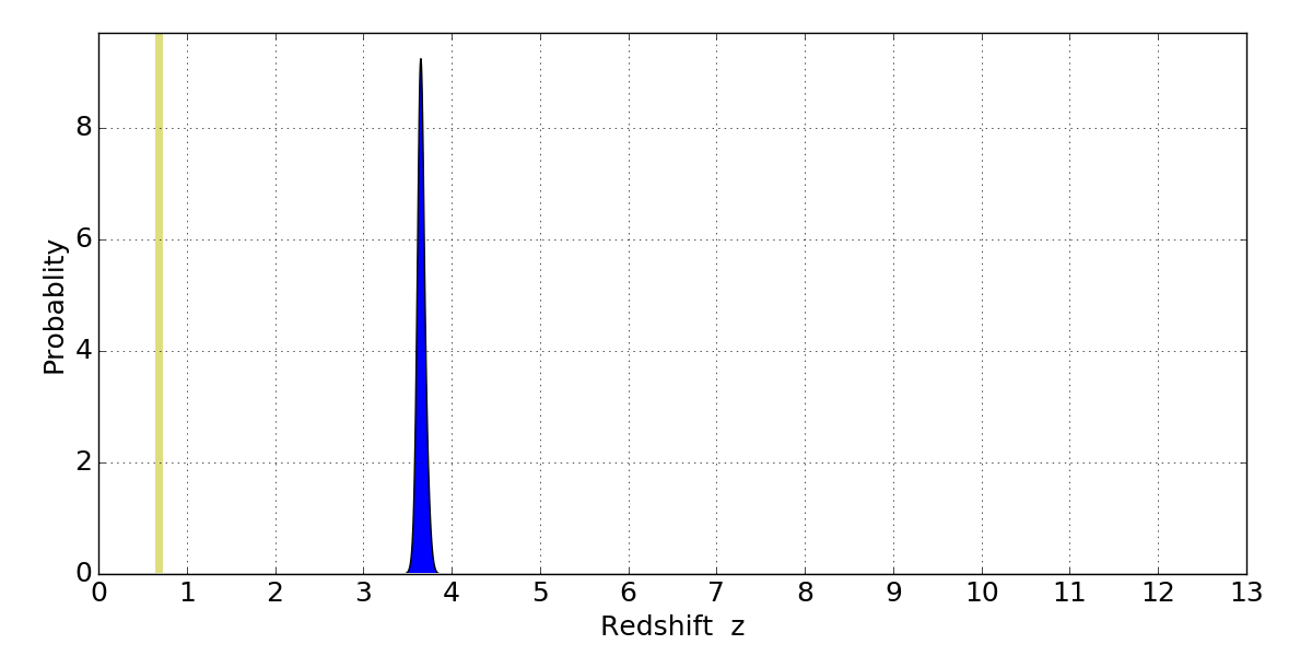In P(z) plots: Yellow lines mark the cluster redshift z = 0.677,