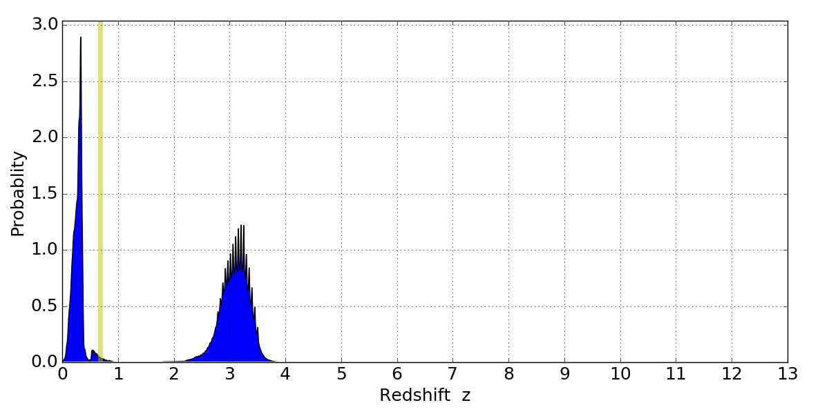 In P(z) plots: Yellow lines mark the cluster redshift z = 0.677,