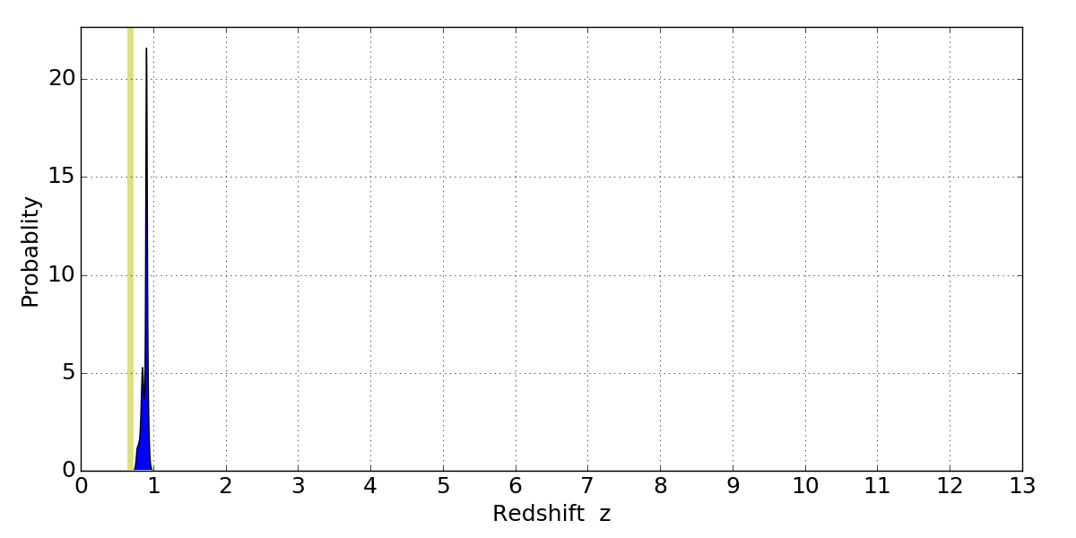 In P(z) plots: Yellow lines mark the cluster redshift z = 0.677,