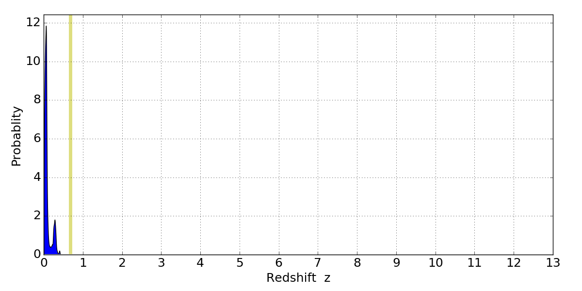 In P(z) plots: Yellow lines mark the cluster redshift z = 0.677,