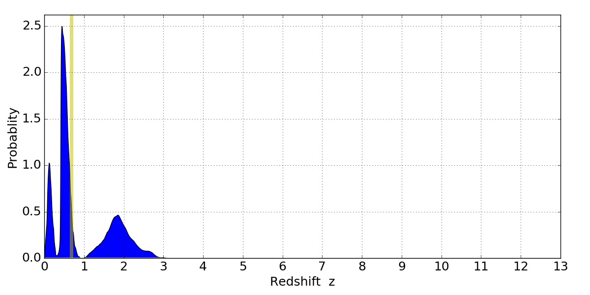 In P(z) plots: Yellow lines mark the cluster redshift z = 0.677,