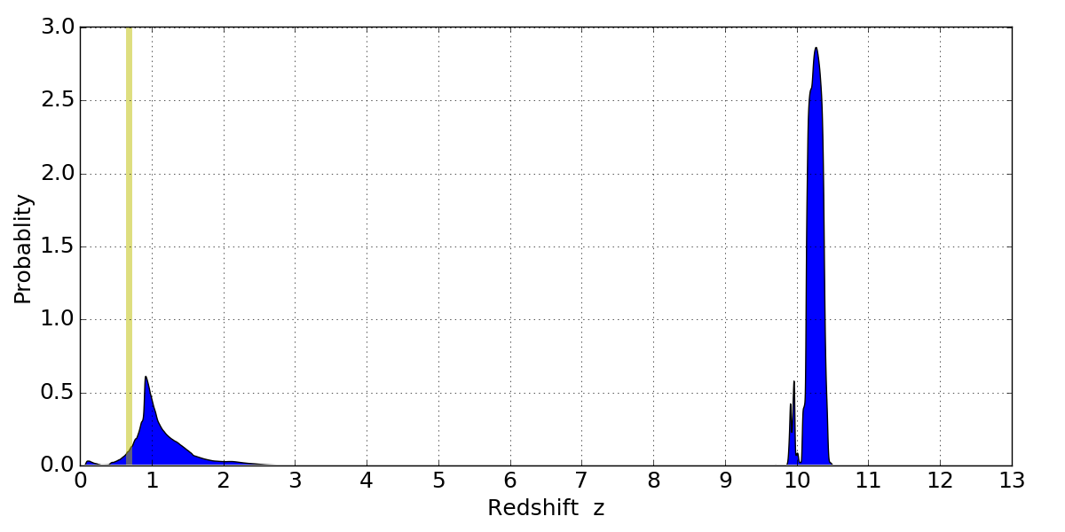 In P(z) plots: Yellow lines mark the cluster redshift z = 0.677,