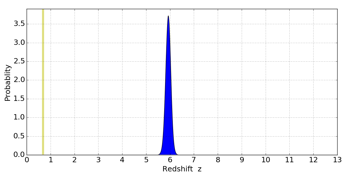 In P(z) plots: Yellow lines mark the cluster redshift z = 0.677,