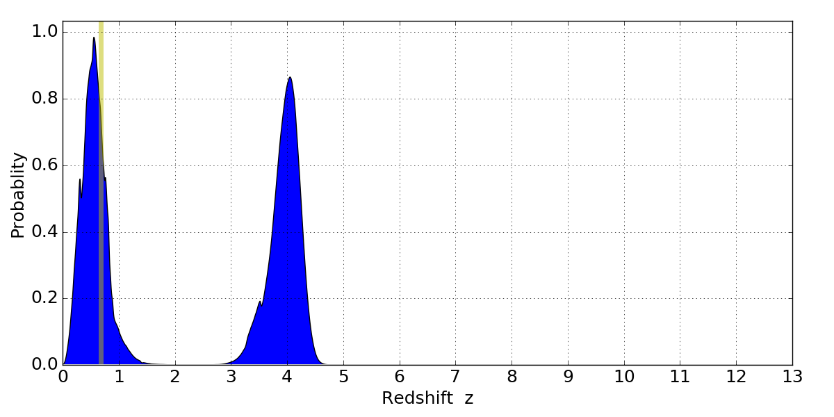 In P(z) plots: Yellow lines mark the cluster redshift z = 0.677,