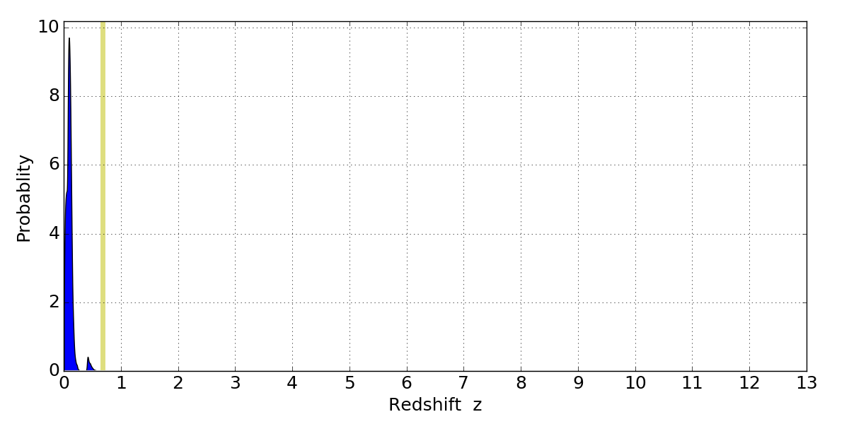 In P(z) plots: Yellow lines mark the cluster redshift z = 0.677,
