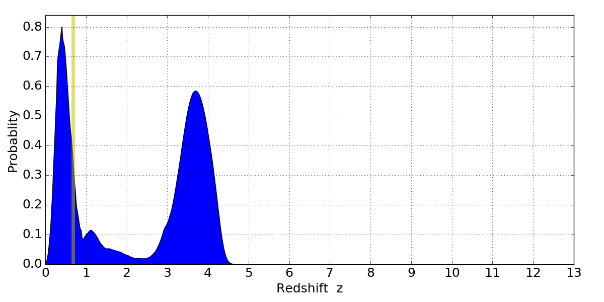 In P(z) plots: Yellow lines mark the cluster redshift z = 0.677,