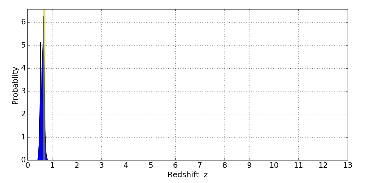 In P(z) plots: Yellow lines mark the cluster redshift z = 0.677,