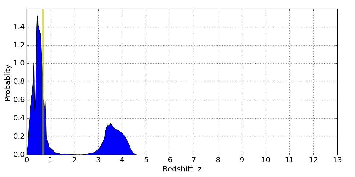 In P(z) plots: Yellow lines mark the cluster redshift z = 0.677,
