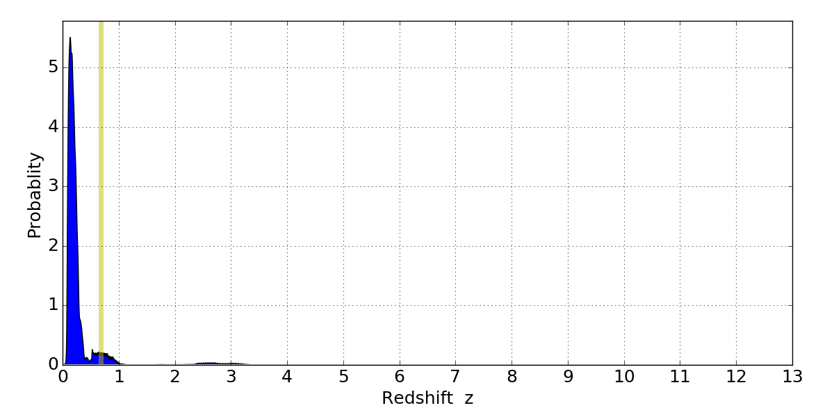 In P(z) plots: Yellow lines mark the cluster redshift z = 0.677,