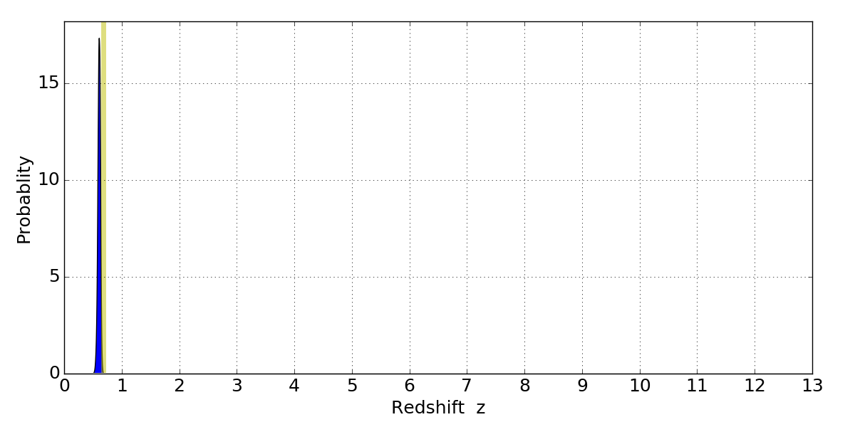 In P(z) plots: Yellow lines mark the cluster redshift z = 0.677,