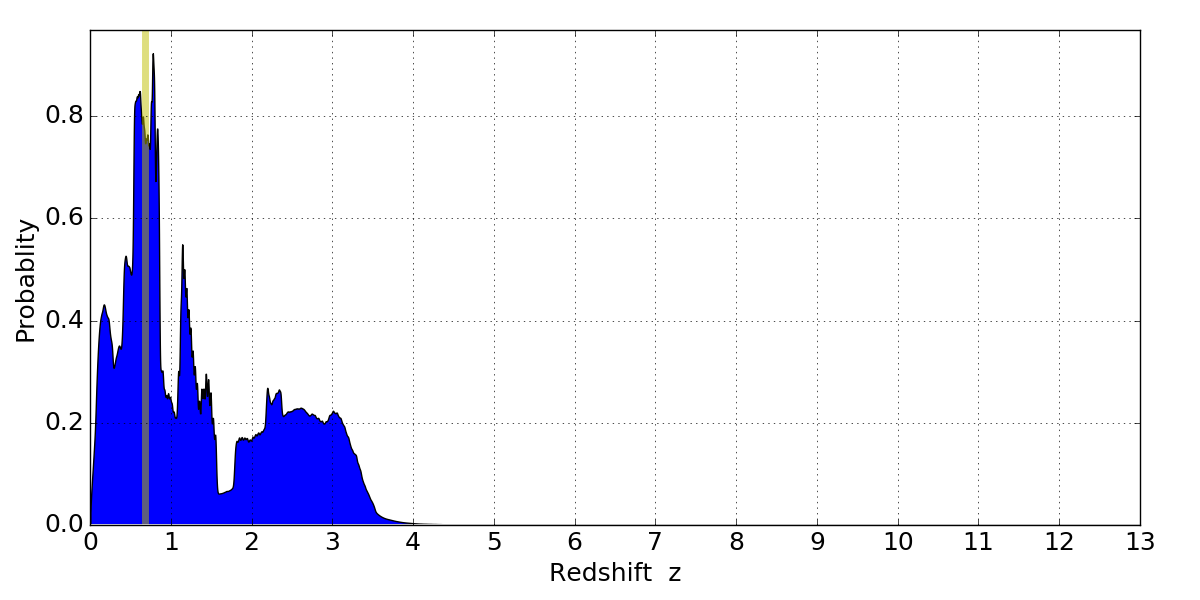 In P(z) plots: Yellow lines mark the cluster redshift z = 0.677,