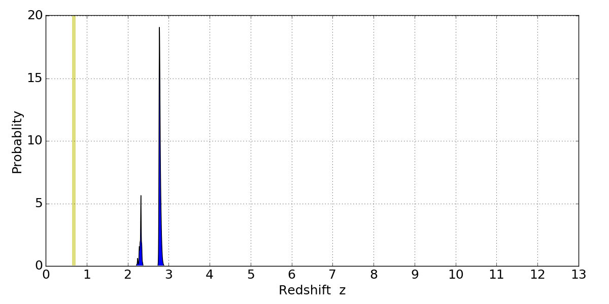 In P(z) plots: Yellow lines mark the cluster redshift z = 0.677,
