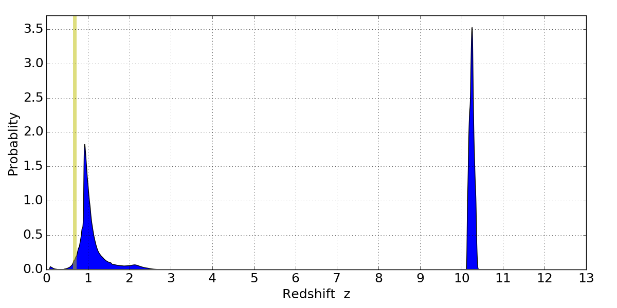 In P(z) plots: Yellow lines mark the cluster redshift z = 0.677,