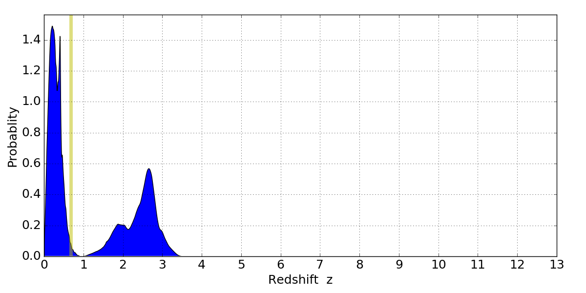 In P(z) plots: Yellow lines mark the cluster redshift z = 0.677,