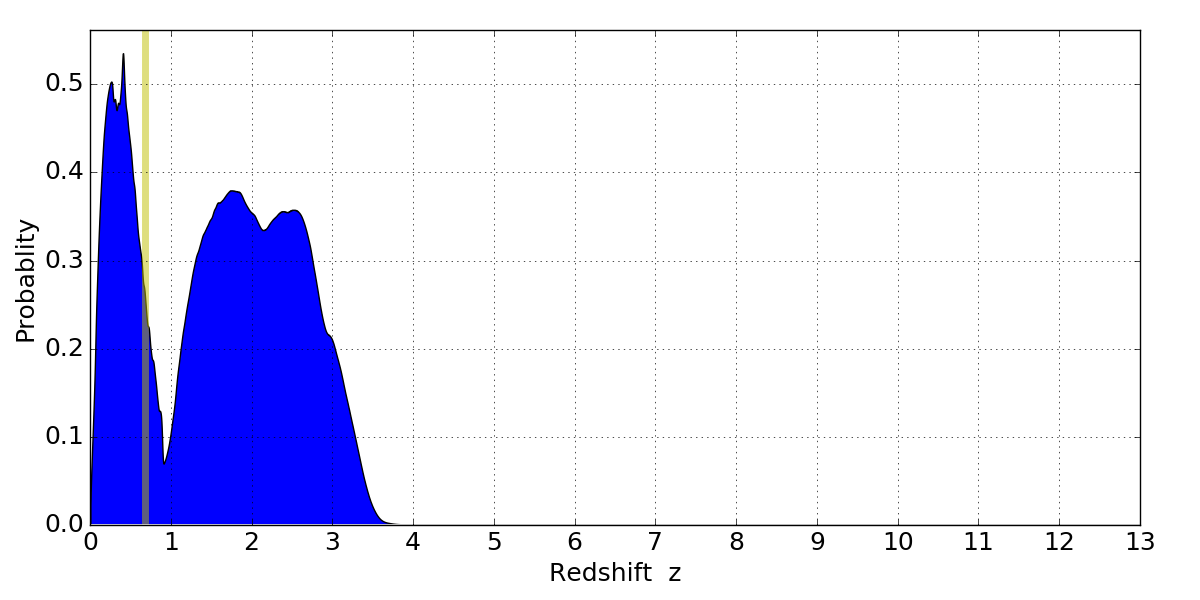 In P(z) plots: Yellow lines mark the cluster redshift z = 0.677,