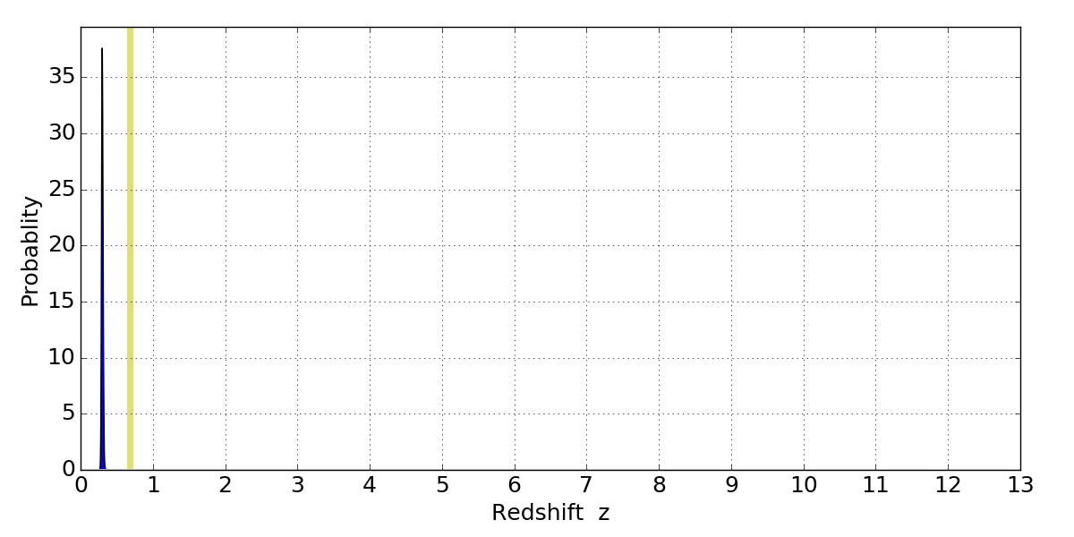 In P(z) plots: Yellow lines mark the cluster redshift z = 0.677,