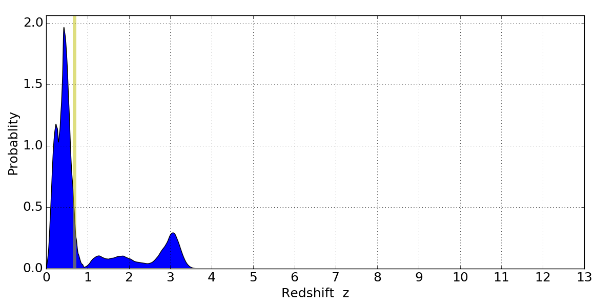 In P(z) plots: Yellow lines mark the cluster redshift z = 0.677,