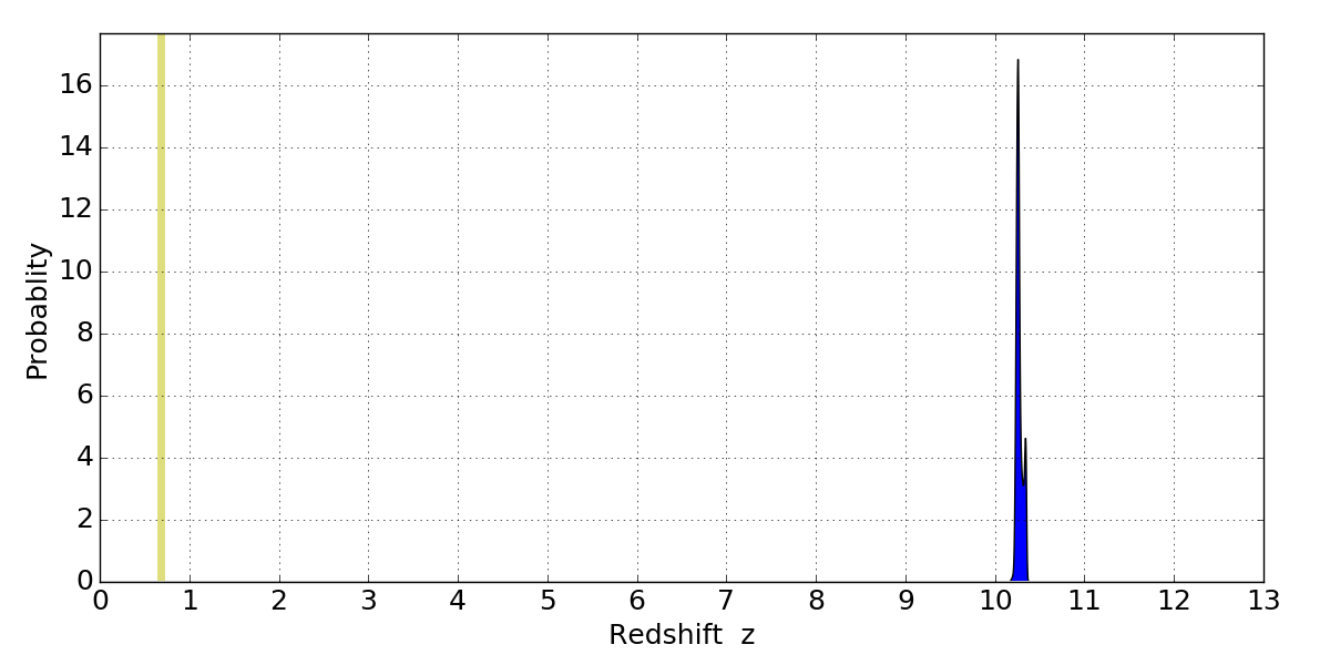 In P(z) plots: Yellow lines mark the cluster redshift z = 0.677,