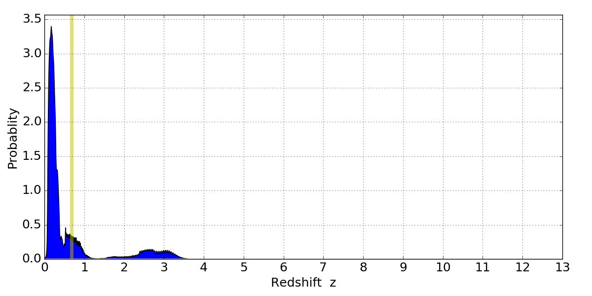 In P(z) plots: Yellow lines mark the cluster redshift z = 0.677,
