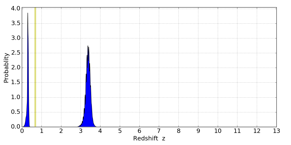In P(z) plots: Yellow lines mark the cluster redshift z = 0.677,