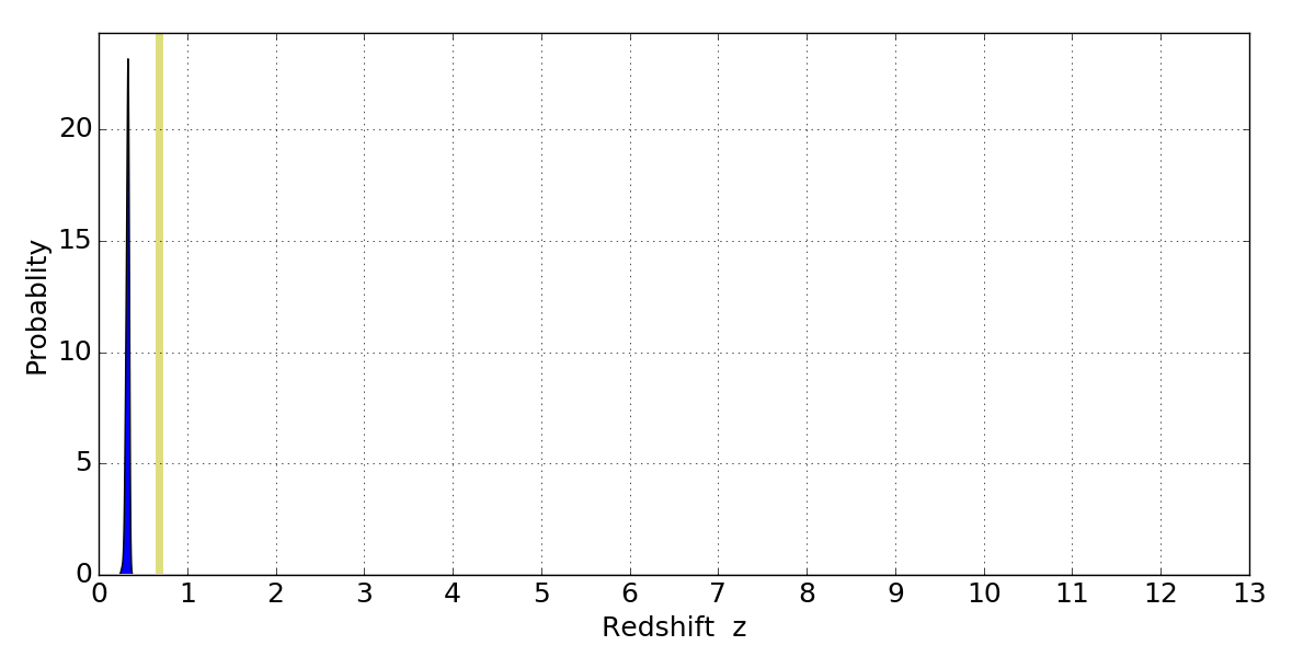 In P(z) plots: Yellow lines mark the cluster redshift z = 0.677,