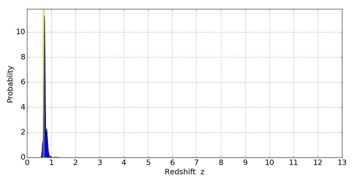 In P(z) plots: Yellow lines mark the cluster redshift z = 0.677,