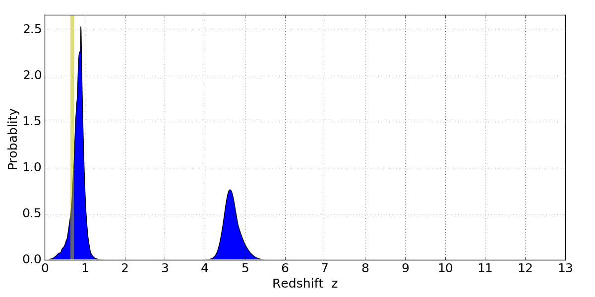 In P(z) plots: Yellow lines mark the cluster redshift z = 0.677,