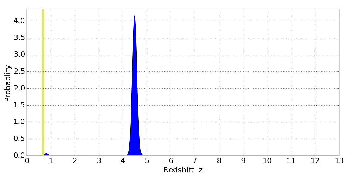 In P(z) plots: Yellow lines mark the cluster redshift z = 0.677,