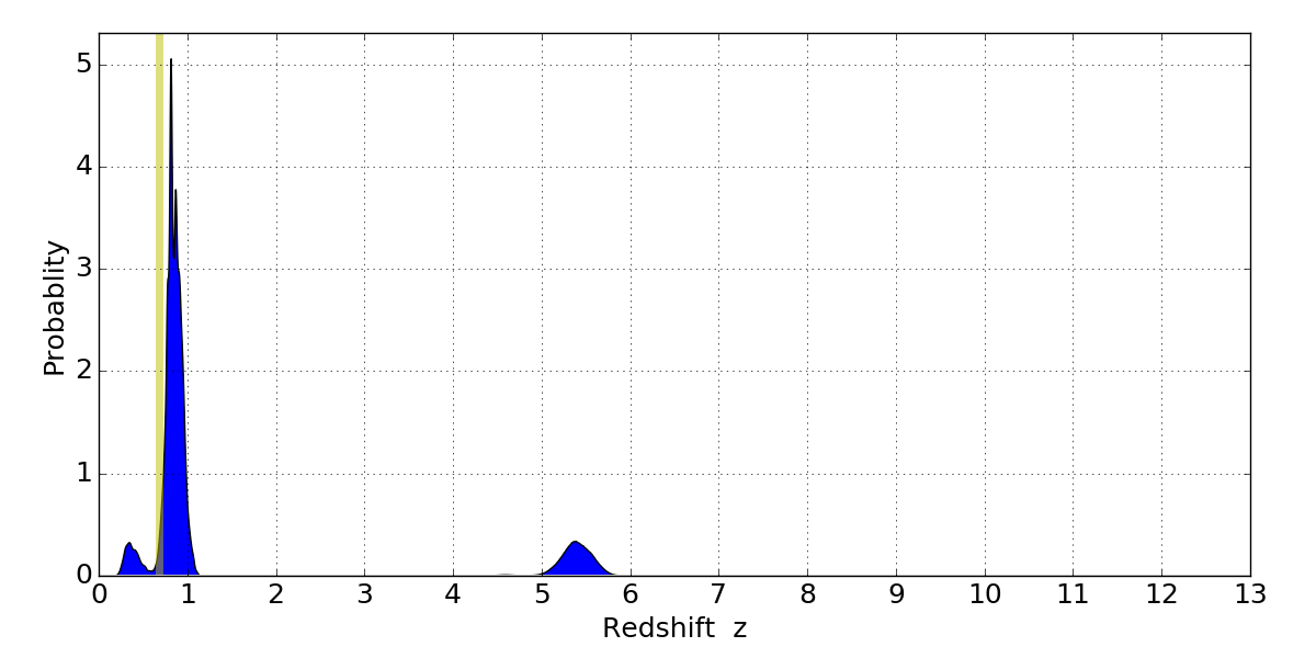 In P(z) plots: Yellow lines mark the cluster redshift z = 0.677,