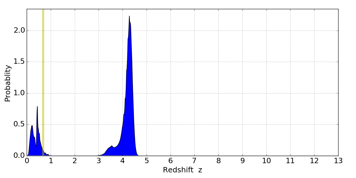 In P(z) plots: Yellow lines mark the cluster redshift z = 0.677,