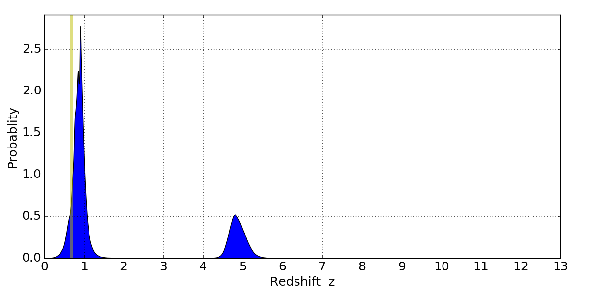 In P(z) plots: Yellow lines mark the cluster redshift z = 0.677,