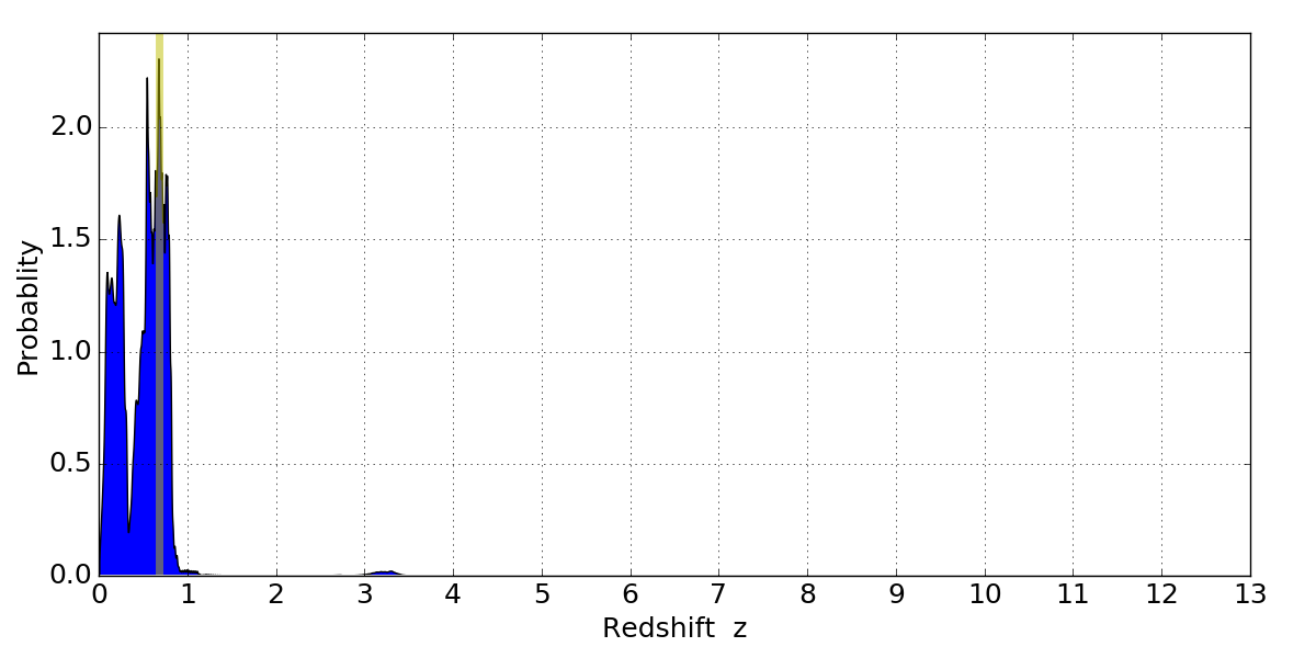 In P(z) plots: Yellow lines mark the cluster redshift z = 0.677,