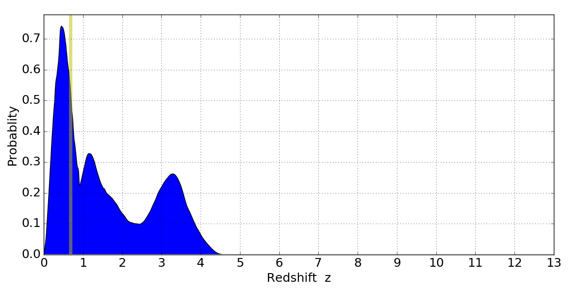 In P(z) plots: Yellow lines mark the cluster redshift z = 0.677,