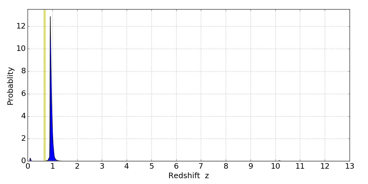 In P(z) plots: Yellow lines mark the cluster redshift z = 0.677,