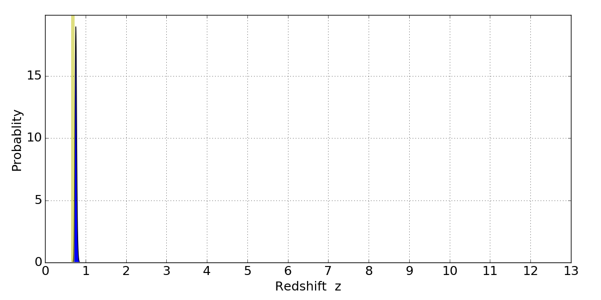 In P(z) plots: Yellow lines mark the cluster redshift z = 0.677,