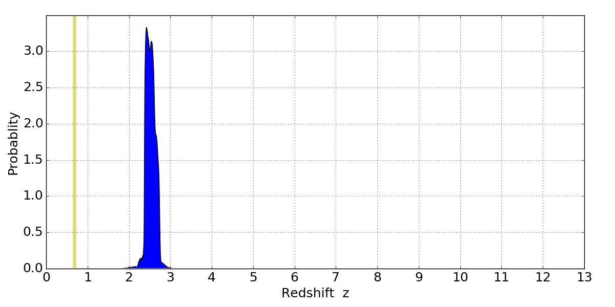 In P(z) plots: Yellow lines mark the cluster redshift z = 0.677,