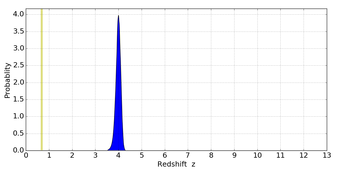 In P(z) plots: Yellow lines mark the cluster redshift z = 0.677,