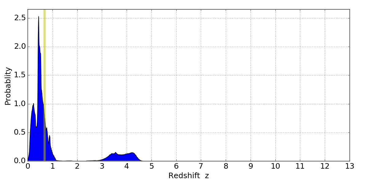 In P(z) plots: Yellow lines mark the cluster redshift z = 0.677,